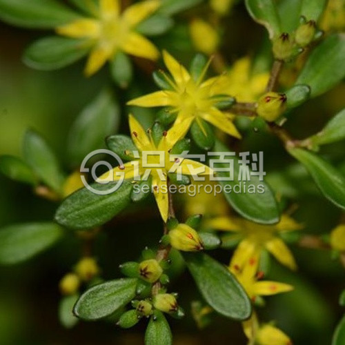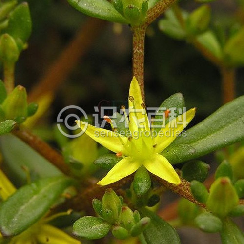 多年生草本。茎斜上,单生或上部有分枝,高10-20厘米。 叶互生,下部叶常脱落,上部叶常聚生,线状楔形、匙形至匙状倒卵形,长1.2-3厘米,宽2-6毫米,先端钝,有时有微缺,基部狭楔形,有距,全缘。 聚伞花序宽5-8厘米,有多花;苞片似叶而小;花无梗,直径1厘米;萼片5,线状匙形,长3-5毫米,宽1-1.5毫米,基部有距;花瓣5,黄色,披针形至披针状长圆形,长4-6毫米,宽1.6-1.8毫米,有短尖,基部稍合生;雄蕊10,对瓣的长2.5毫米,在基部上1-1.5毫米处着生,对萼的长4毫米;鳞片5,匙状正方形,长1.2毫米,先端钝截形;心皮5,卵状披针形,直立,基部合生,全长4毫米,花柱长1毫米在内。 蓇葖斜叉开;种子多数,长0.6毫米,褐色。 花期4-5月,果期6-8月。