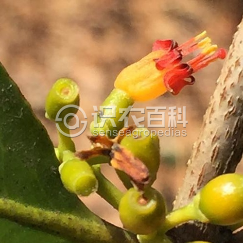 灌木,高0.5-1.3米,全株无毛;小枝灰色,具皮孔。叶革质,阔椭圆形至披针形,有时卵形,长5-10厘米,宽2.5-6厘米,顶端急尖或渐尖,基部楔形或阔楔形,中脉在上面扁平,在下面凸起,侧脉4-5对,在下面明显或两面均不明显;叶柄长0.5-1厘米。总状花序,1-3个腋生或生于小枝已落叶腋部,花序梗长1.5-2厘米,具花4-8朵;花梗长4-6毫米,苞片阔卵形,长1-2毫米,小苞片2枚,三角形,长1-1.5毫米,基部彼此合生,花托椭圆状,长2-2.5毫米;副萼环状,长约0.5毫米;花冠橙色,长1-1.5厘米,冠管膨胀,具六棱,裂片6枚,披针形,长约4毫米,反折;花丝长约2毫米,花药长1毫米;花柱线状,柱头头状。果近球形,长约8毫米,直径7毫米,橙色,果皮平滑。花期2-6月,果期5-8月。