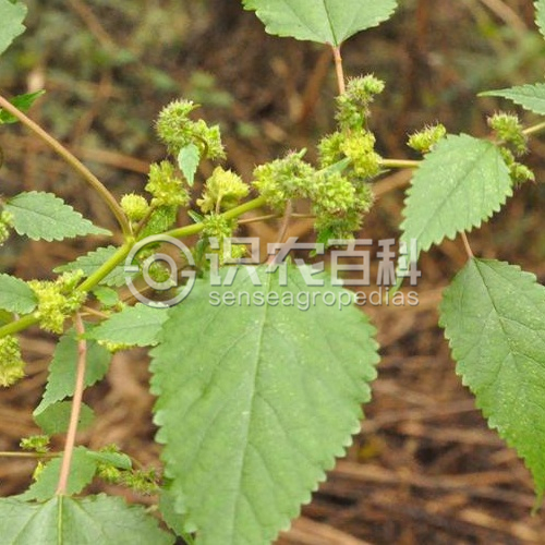 一年生草本,高30-80厘米,枝直立,纤细,少分枝或不分枝,幼时绿色后变黑色,微被长柔毛。叶膜质,卵圆形至宽卵圆形,长5-10厘米,宽3-5厘米,先端急尖,基部心形至楔形,边缘锯齿三角形,微钝,两面被粗糙贴伏柔毛,侧脉每边3-4条;叶片在基部稍下延成叶柄;叶柄被柔毛。花单性,聚伞花序腋生,直径约5毫米;雄花钟形;花被裂片长约1毫米,雄蕊伸出花被片外,与花被片对生;雌花,花被片宽舟状,稍长于雄花被片,子房近扁球形,花柱侧生,丝状,长1-1.5毫米,约长于子房2倍。瘦果略扁,具三棱,表面散生细小瘤体;种子1颗。花期5-8月。