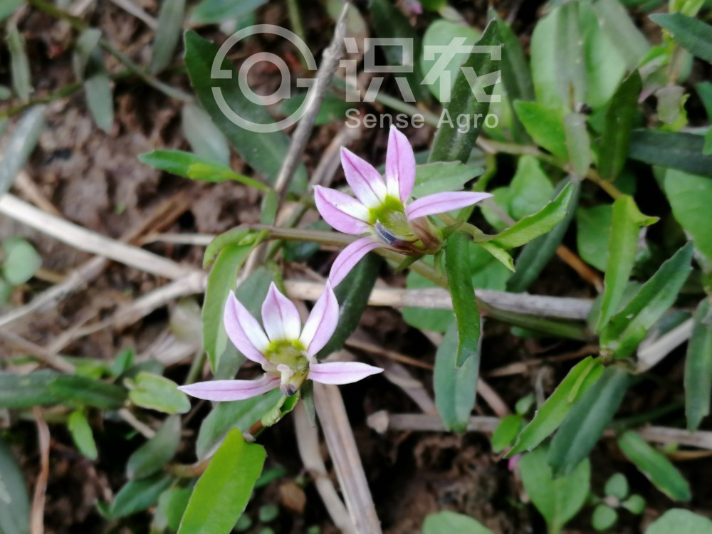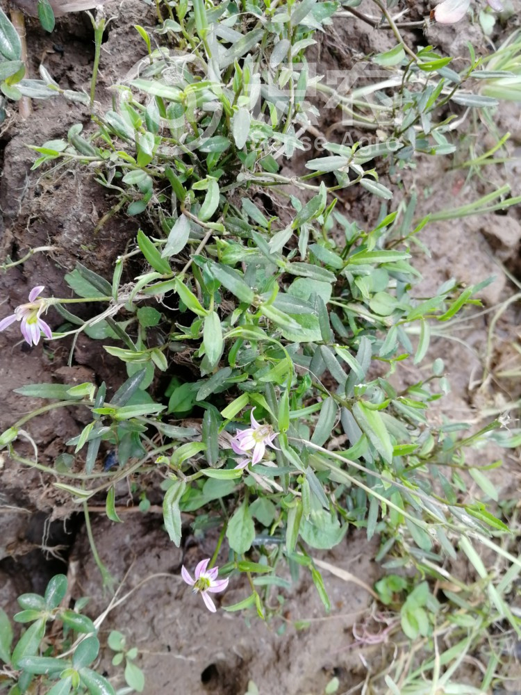 茎细弱,匍匐,节上生根,分枝直立,高6-15厘米,无毛。叶互生,无柄或近无柄,椭圆状披针形至条形,长8-25厘米,宽2-6厘米,先端急尖,基部圆形至阔楔形,全缘或顶部有明显的锯齿,无毛。花通常1朵,生分枝的上部叶腋;花梗细,长1.2-2.5 (3.5) 厘米,基部有长约1毫米的小苞片2枚、1枚或者没有,小苞片无毛;花萼筒倒长锥状,基部渐细而与花梗无明显区分,长3-5毫米,无毛,裂片披针形,约与萼筒等长,全缘或下部有1对小齿;花冠粉红色或白色,长10-15毫米,背面裂至基部,喉部以下生白色柔毛,裂片全部平展于下方,呈一个平面,2侧裂片披针形,较长,中间3枚裂片椭圆状披针形,较短;雄蕊长约8毫米,花丝中部以上连合,花丝筒无毛,未连合部分的花丝侧面生柔毛,花药管长约2毫米,背部无毛或疏生柔毛。蒴果倒锥状,长约6毫米。种子椭圆状,稍扁压,近肉色。花果期5-10月。
