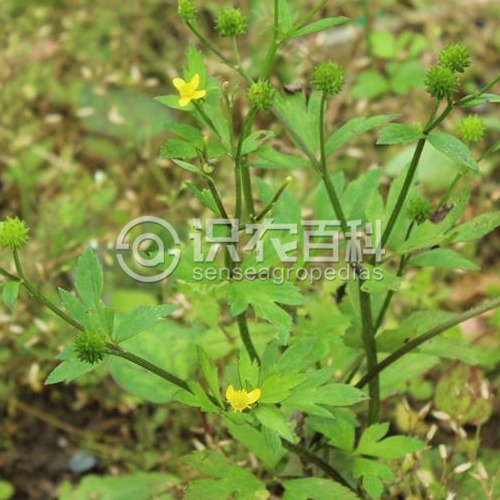 须根多数簇生。茎直立,高30-70厘米,中空,有槽,具分枝,生开展或贴伏的柔毛。基生叶多数;叶片圆心形或五角形,长及宽为3-10厘米,基部心形或截形,通常3深裂不达基部,中裂片倒卵状楔形或宽卵圆形或菱形,3浅裂,边缘有粗齿或缺刻,侧裂片不等地2裂,两面贴生柔毛,下面或幼时的毛较密;叶柄长达15厘米,生开展柔毛。下部叶与基生叶相似,渐向上叶柄变短,叶片较小,3深裂,裂片披针形,有尖齿牙或再分裂;最上部叶线形,全缘,无柄。聚伞花序有多数花,疏散;花直径1.5-2.2厘米;花梗长达8厘米,贴生柔毛;萼片椭圆形,长4-6毫米,生白柔毛;花瓣5,倒卵状圆形,长6-11毫米,宽4-8毫米,基部有长约0.5毫米的爪,蜜槽鳞片长1-2毫米;花药长约1.5毫米;花托短小,无毛。聚合果近球形,直径6-8毫米;瘦果扁平,长2-2.5毫米,上部最宽处与长近相等,约为厚的5倍以上,边缘有宽约0.2毫米的棱,无毛,喙短直或外弯,长约0.5毫米。花果期4月至9月。