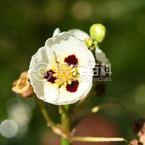 (2-) 3花;苞片3枚,基部多少合生,膜质或草质。花两性或单性,通常生于花序下部1-3轮者为两性,花梗短粗,长1-1.5厘米,花后多少下弯;心皮多数,分离,两侧压扁,花柱自腹侧伸出,斜上;雄花数轮,位于花序上部,花梗细弱,长2-5厘米;两性花与雄花的花被片大小近于相等,或内轮稍大于外轮,外轮花被片广卵形,长约5-9毫米,宽3-8毫米,或更大,宿存,花后包果实下部,内轮花被片白色,基部淡黄色,稀在基部具紫色斑点,倒卵形,早落;雄蕊6枚至多数,花丝长短不一,通常2-3 (-4) 毫米;花药长1-2 (-3) 毫米,宽1-1.5毫米,椭圆形,黄色。瘦果两侧压扁,果皮厚纸质,倒卵形或椭圆形,长2-3毫米,宽1.5-2.5毫米,基部具短柄,背腹部具鸡冠状齿裂;果喙自腹侧斜出。果期花托突起,圆柱状,高3-4毫米,宽1.5-2.5毫米。种子褐色,长1-1.5毫米。花果期5-11月。2n=22。