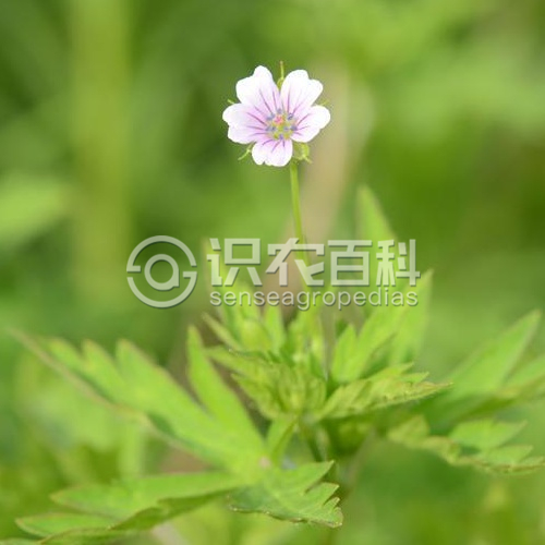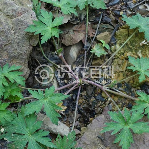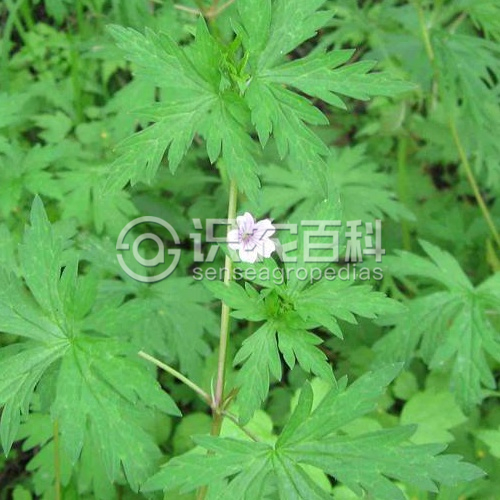 高30-70厘米,根为直根,有时具不多的分枝。茎纤细,仰卧或近直立,多分枝,具棱槽,被倒向疏柔毛。叶对生;托叶披针形,棕褐色,长8-12厘米,先端渐尖,基部抱茎,外被倒向长柔毛;基生叶和茎下部叶具长柄,柄长为叶片的2-3倍;下部叶片肾状五角形,基部宽心形,长3-6厘米,宽4-8厘米,掌状5深裂,裂片倒卵形、菱形或长椭圆形,中部以上齿状羽裂或齿状深缺刻,下部楔形,两面被疏伏毛,背面沿脉被毛较密;上部叶片具短柄,3-5裂。总花梗丝状,单生于叶腋,长于叶,被倒向柔毛或伏毛,具1花或偶具2花;苞片对生,棕褐色、钻伏、膜质,生于花梗中部或基部;萼片卵状椭圆形或卵状披针形,长约5毫米,先端急尖,具短尖头,背面沿脉被疏柔毛;花瓣倒卵形,淡紫色或白色,等于或稍长于萼片,先端微凹或缺刻状,基部具短爪;花丝扩大成披针形,具缘毛;花柱不明显,分枝长约1毫米。蒴果长15-18毫米,被疏柔毛,果梗下垂。种子肾状椭圆形,黑色,长约2毫米,宽约1毫米。花期6-7月,果期8-9月。