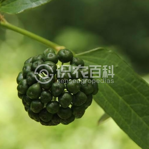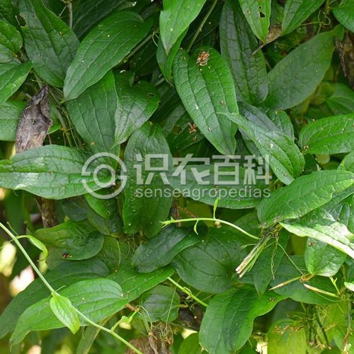 叶比上种厚,形状变化较大,长7-15厘米,宽2.5-11厘米,下面绿色,无毛;叶柄长7-20毫米,通常在中部以下有卷须。伞形花序总花梗较纤细,长3-5 (-10)厘米;小苞片长1-2毫米,在花期一般不落;雌花比雄花略小,不具或具钻形退化雄蕊。浆果直径7-9毫米。花期6-7月,果期10月。